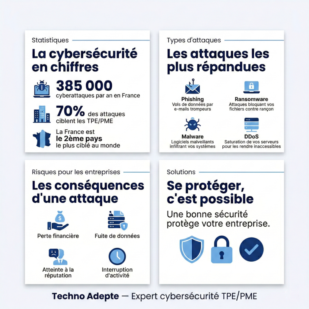 Avant d’aborder les solutions, posons le contexte. En France, on recense près de 385 000 cyberattaques par an. Ce chiffre provient des rapports de l’ANSSI. Il est souvent cité, mais rarement compris dans ce qu’il implique pour une petite structure.